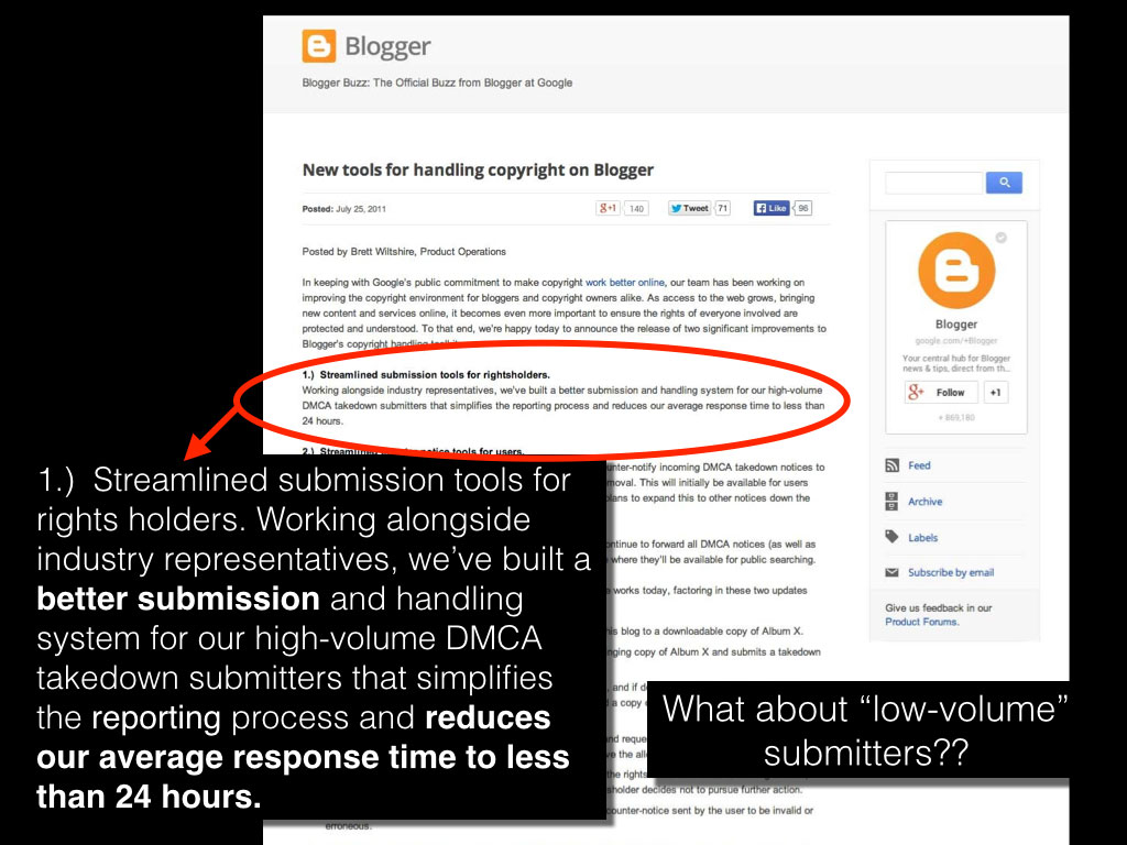 Each speaker presented a PowerPoint, links to which can be found here and a video archive here. As with the initial hearing in March, Google was represented by its Legal Director for Copyright, Fred von Lohmann who walked the audience through Google’s “DMCA notice and takedown tools” and highlighted what he called the company’s “trusted submitter program.” In his PowerPoint, Mr. von Lohmann referenced Google blog post from 2011 “New tools for handling copyright on Blogger” that supposedly highlighted the great progress that’s been made in streamlining the process.